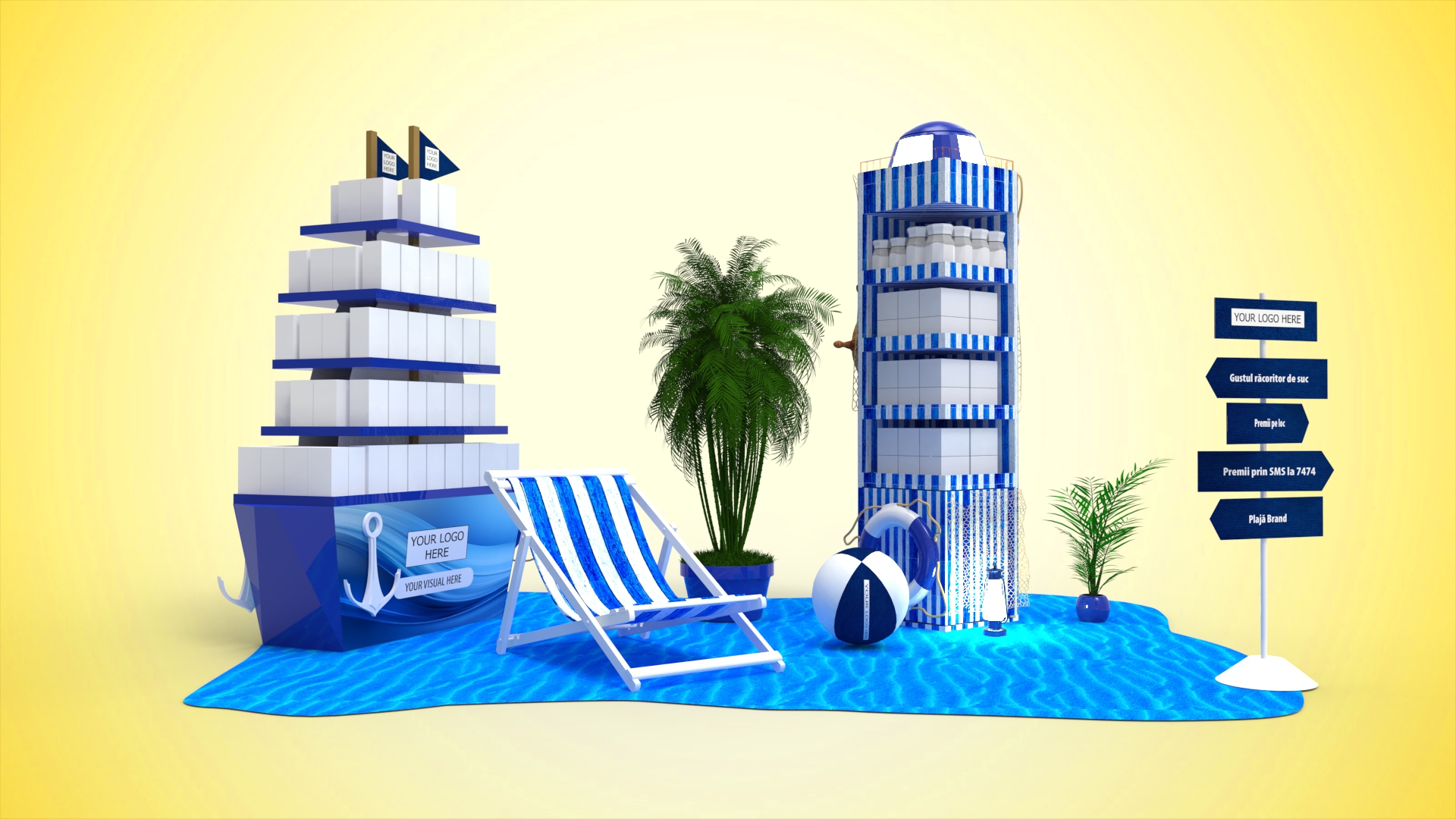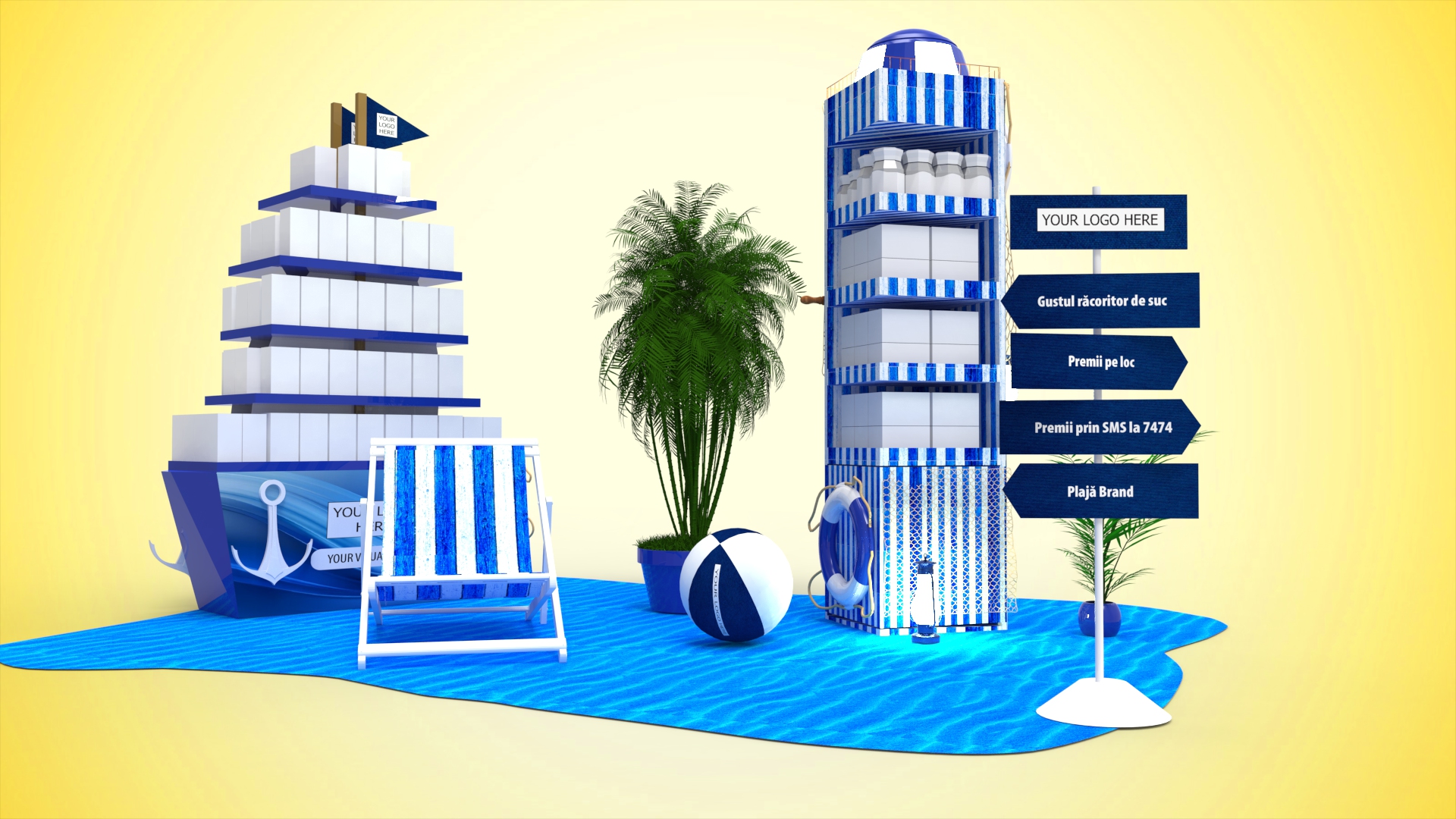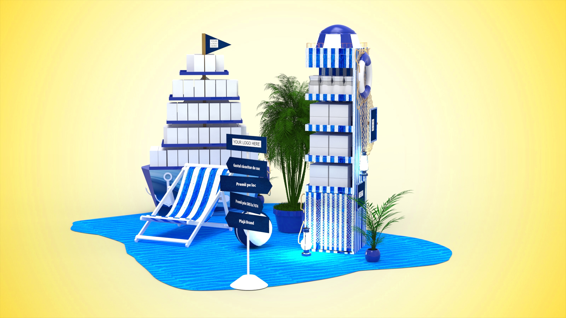 Atrage clienții în magazin și creează o experiență memorabilă cu grupajul de display special, inspirat de spiritul verii! Setul include un display de 1 palet captivant în formă de vapor, un stand slim sub formă de far cu colac de salvare, plus elemente tematice – plante, scaun de plajă, minge de plajă – care dau viață spațiului de plasare și îți transformă locația într-o veritabilă oază de vacanță. Grupajul este modular și se poate adapta pe diferite formate de magazine.